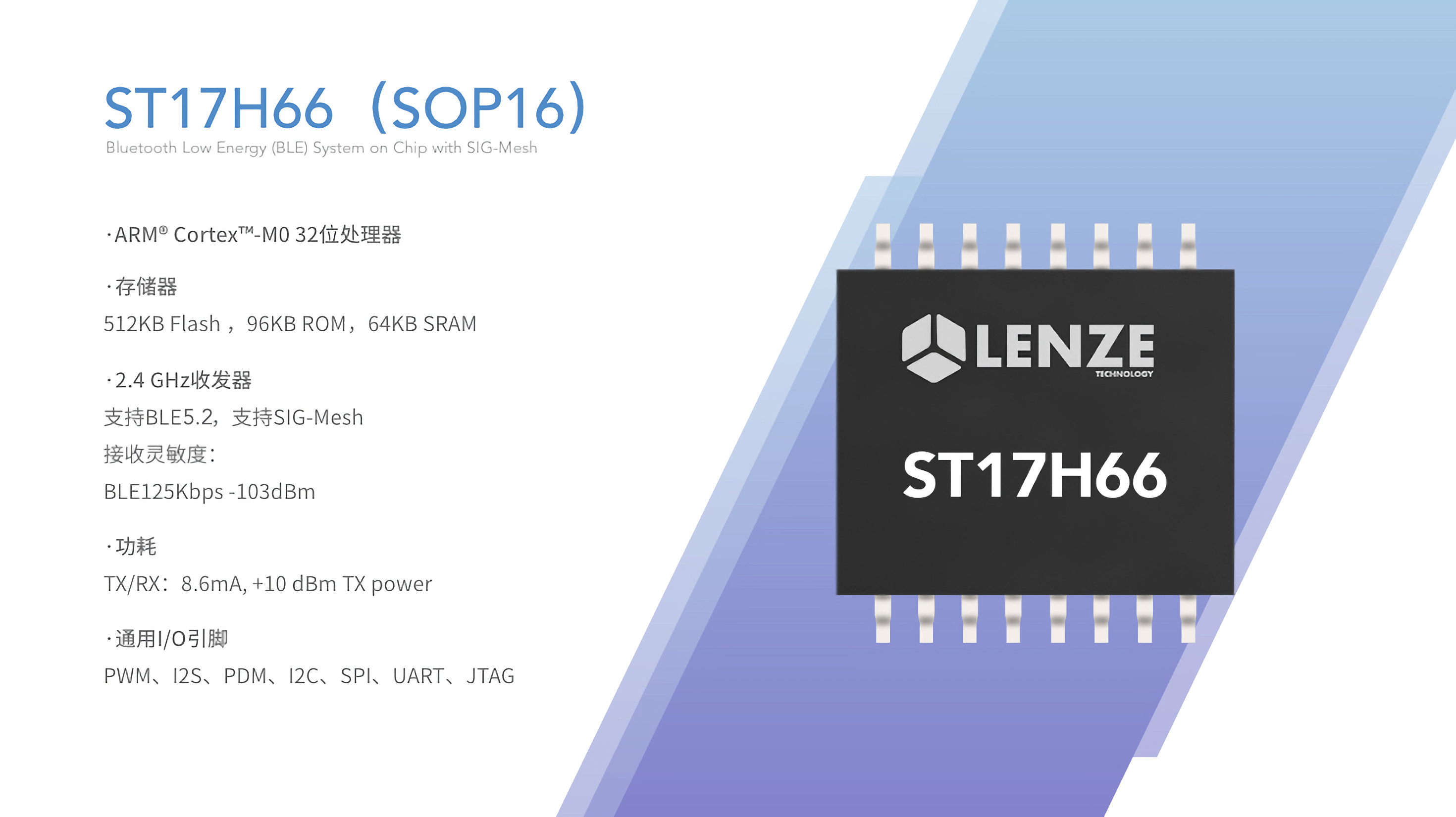 最新推出的ST17H66蓝牙BLE5.2芯片,支持蓝牙Mesh,支持一对多,多对多等控制模式,为企业提供“交钥匙”式解决方案,备有全面详细的参考设计,方便客户快速开发产品和面市,第一时间抢占物联网先机。