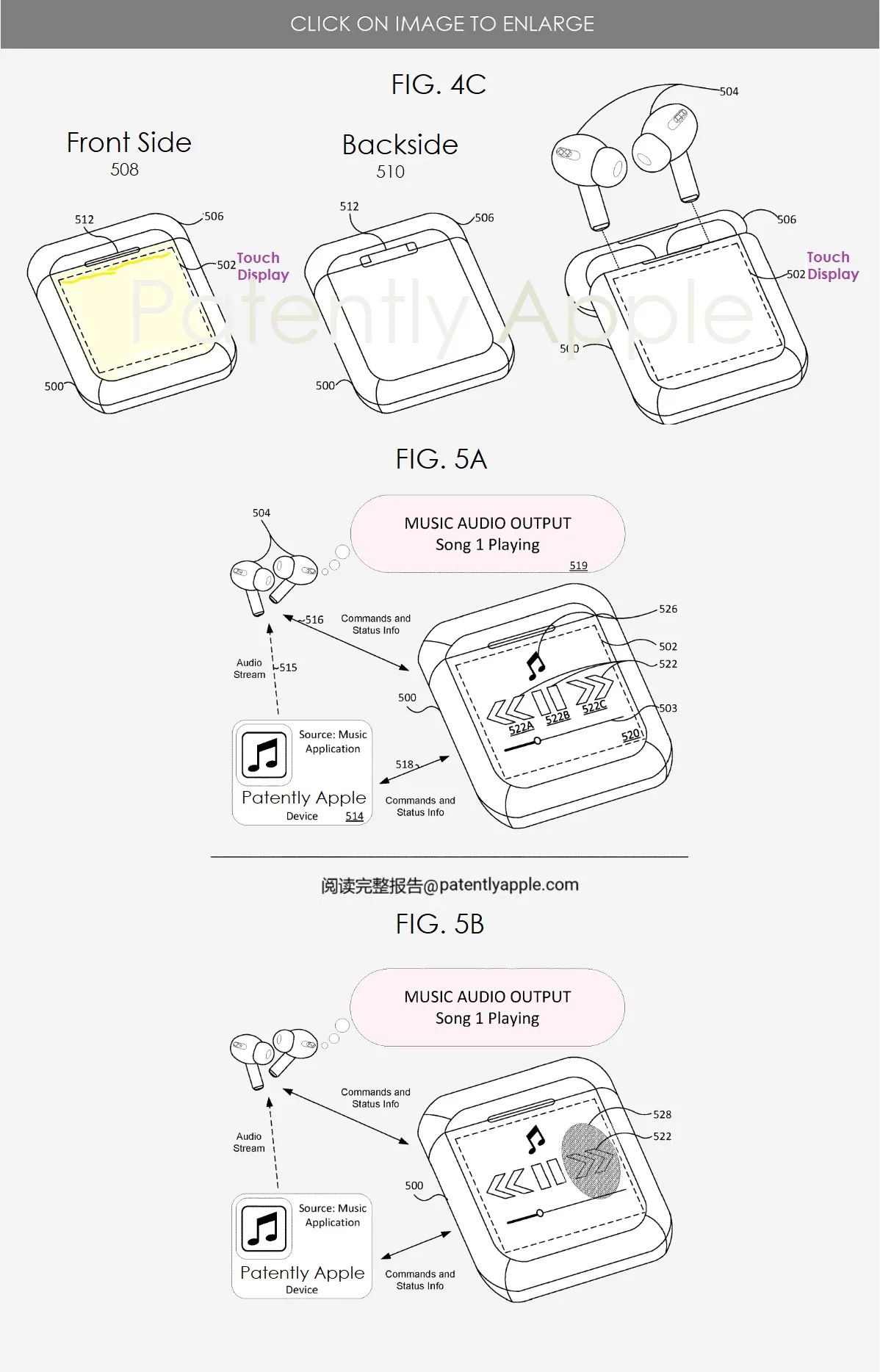 从分享的专利设计草图中可以看到,AirPods 耳机充电盒配有一个图形用户界面(GUI),配有“上一首”、“暂停”、“下一首”、当前歌曲播放时间进度、当前播放歌曲名称等,专利中还提及可以控制显示歌词内容。